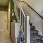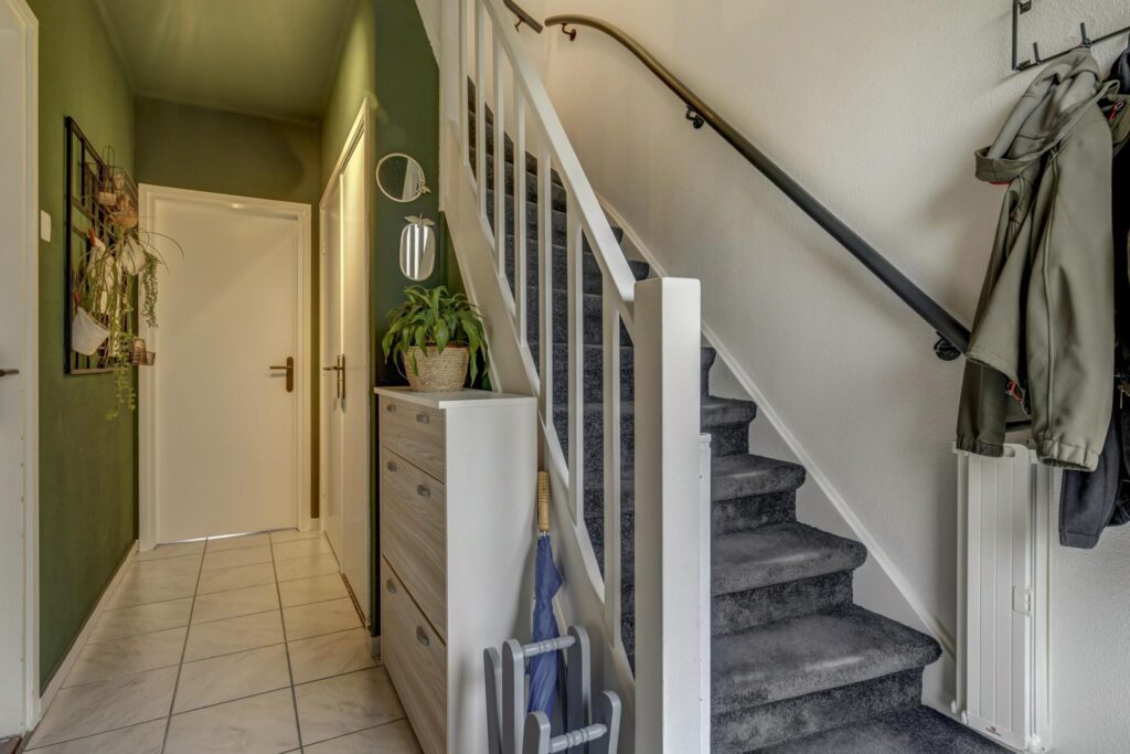 Open de voordeur naar de ruime hal, waar de trap direct de aandacht trekt. Vanuit de hal zijn een wijn-/provisiekelder en de toiletruimte met fonteintje te bereiken.