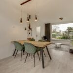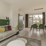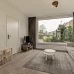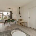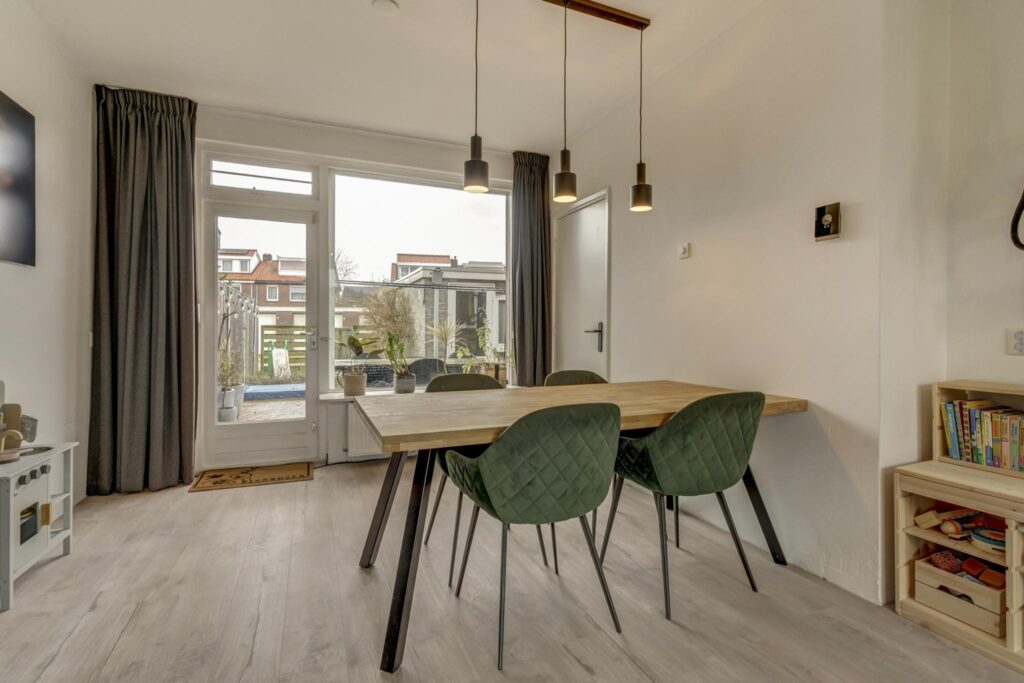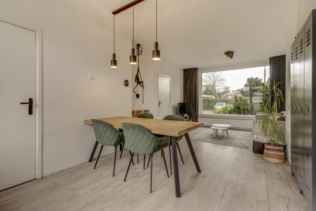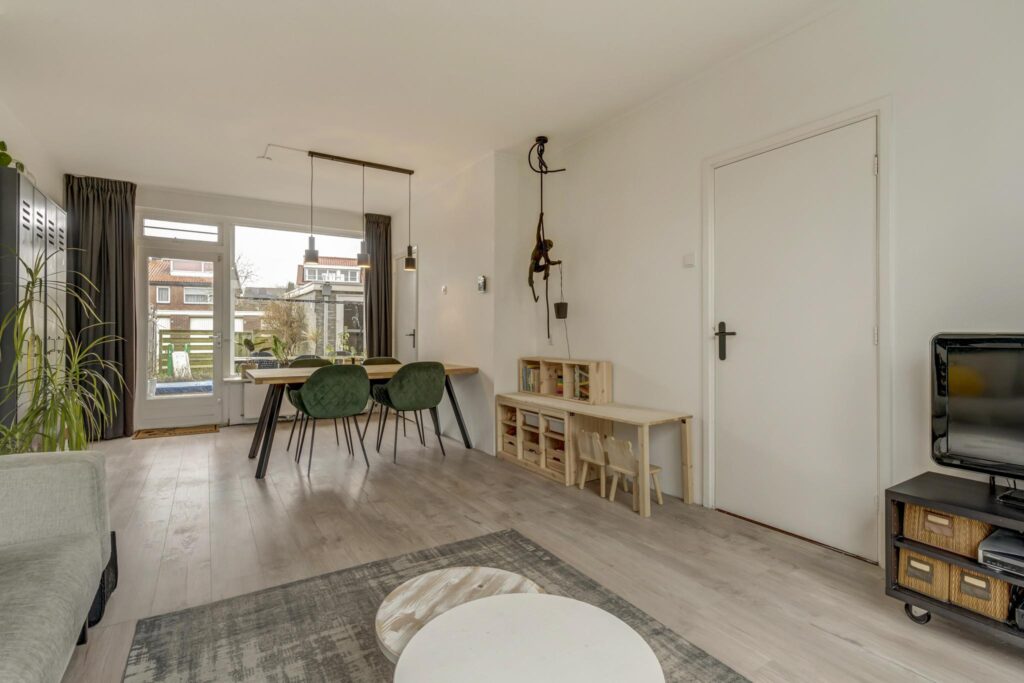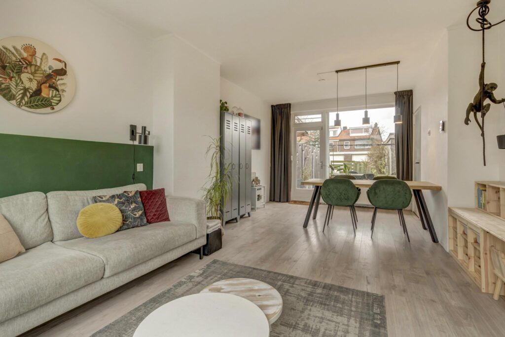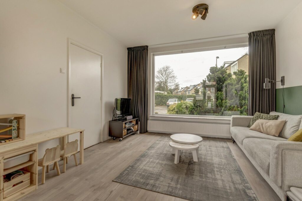 De circa 7 meter diepe woonkamer met laminaatvloer heeft grote ramen aan de voor- en achterzijde, waardoor veel licht naar binnen valt. Ook het uitzicht naar de tuin en de rustige straat is fraai. Het zitgedeelte bevindt zich aan de voorzijde en het eetgedeelte bevindt zich bij de deur naar de keuken.