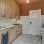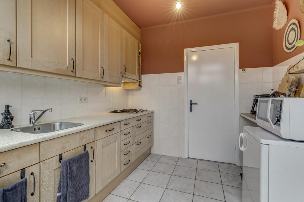 In de keuken staat een wandopstelling met een licht aanrechtblad, veel bergruimte en diverse inbouwapparatuur: een gaskookplaat, afzuigkap en een vaatwasser.
