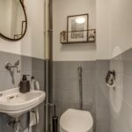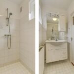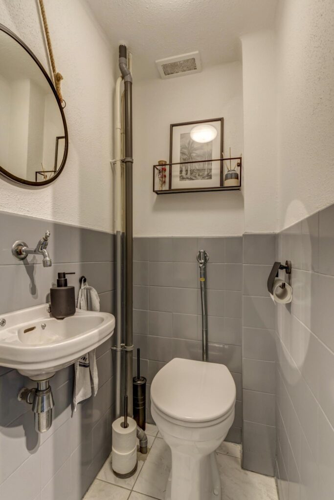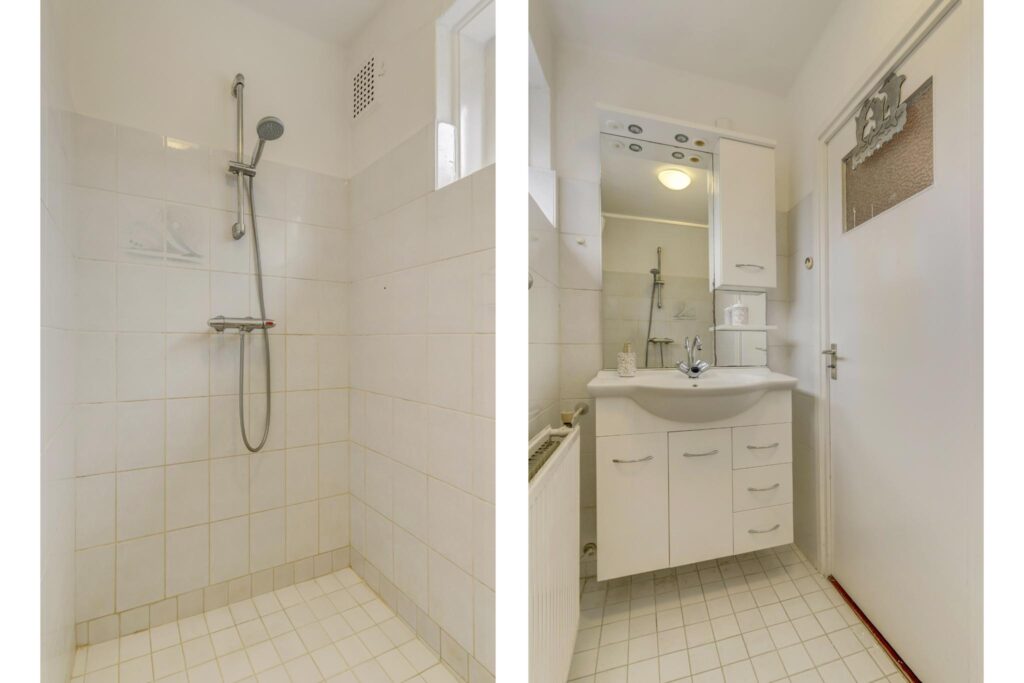 Aan de voorzijde is de badkamer, ingedeeld met een douche en een wastafelmeubel. Ook is er een separate toiletruimte op deze verdieping.