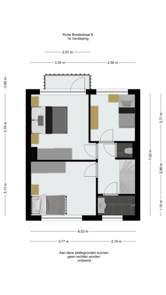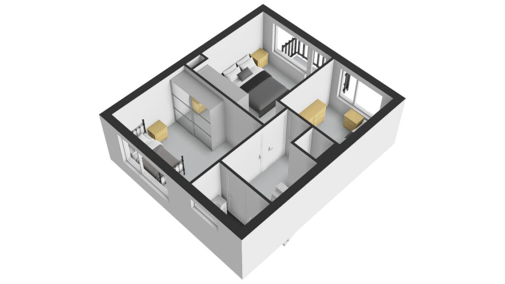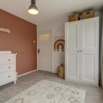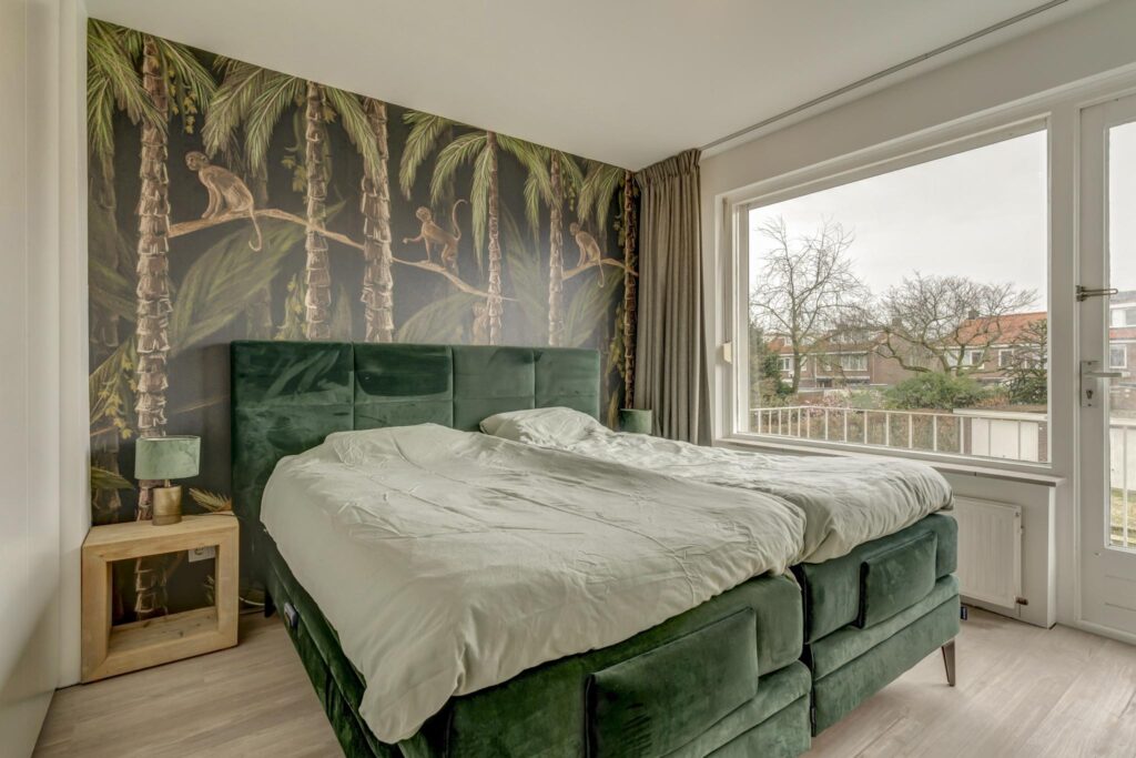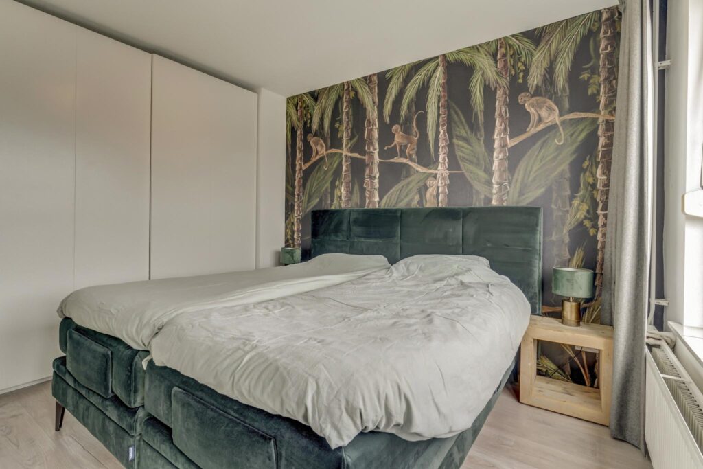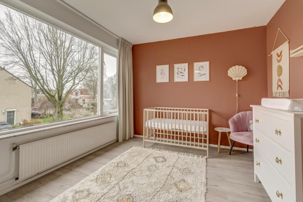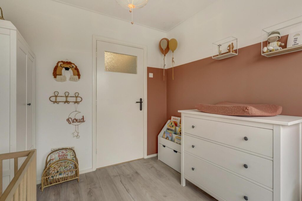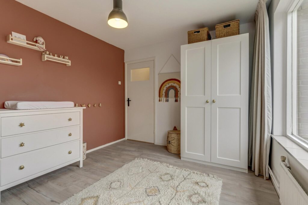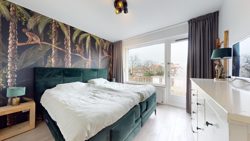Wat dit type woning heel aantrekkelijk maakt, zijn de ruime slaapkamers. Op de eerste verdieping zijn drie slaapkamers, waarvan twee aan de achterzijde. Een van deze kamers is de hoofdslaapkamer met een deur naar het balkon. In alle slaapkamers zie je verschillende kleuren, patroonbehang en een laminaatvloer.