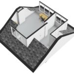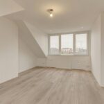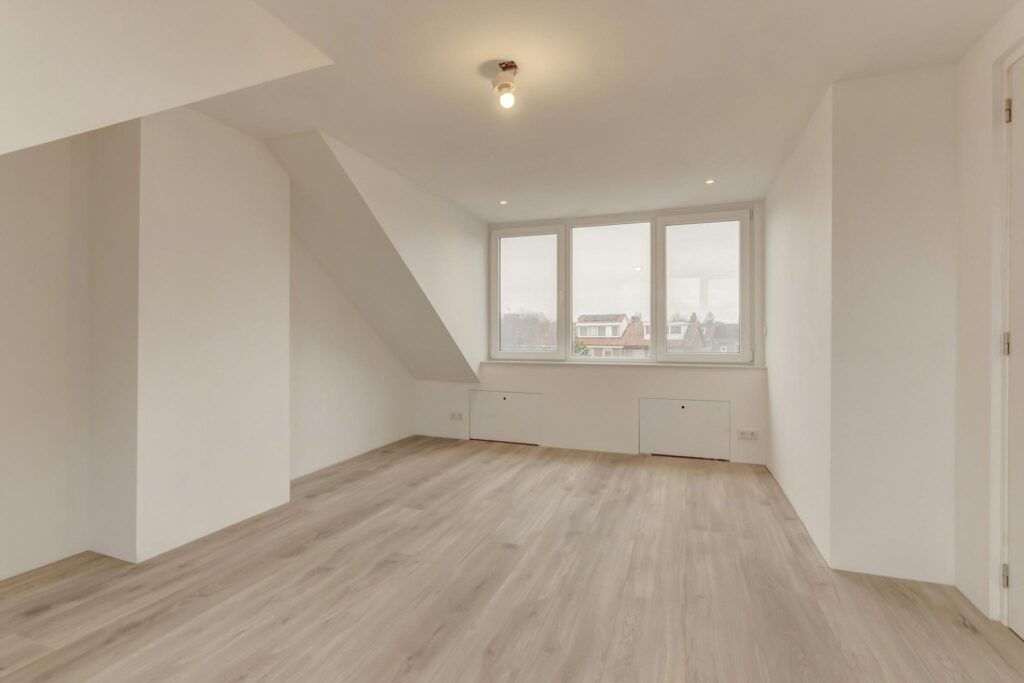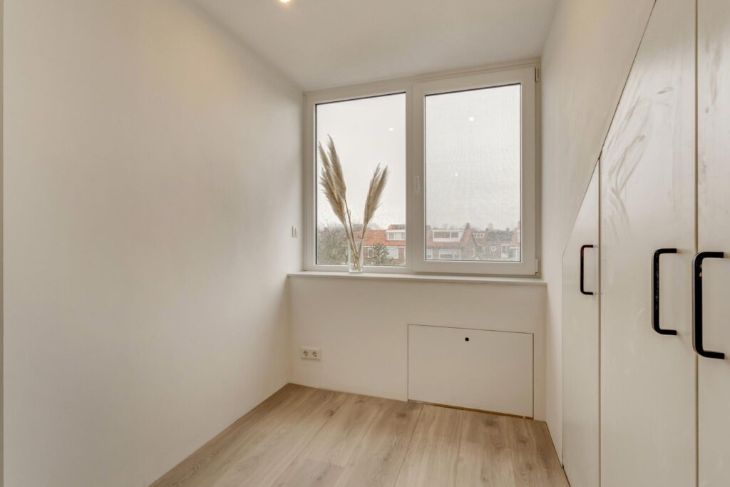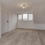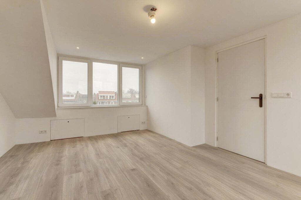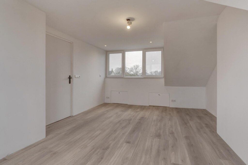 Aansluitend is de vierde slaapkamer, die om een mooie invulling vraagt. Er ligt, net als op de overloop, laminaat op de vloer en er is praktische bergruimte in de schuinten van het dak.