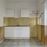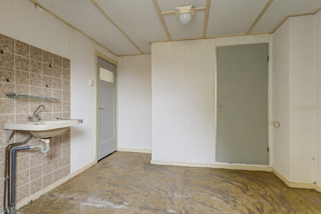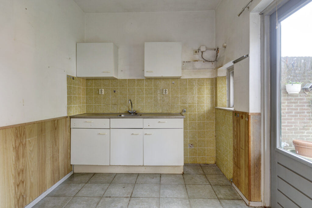 De dichte keuken is voorzien van een eenvoudig aanrecht met onder- en bovenkasten en biedt toegang tot de achtertuin (15m diep & 11m breed).
