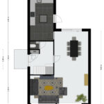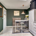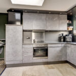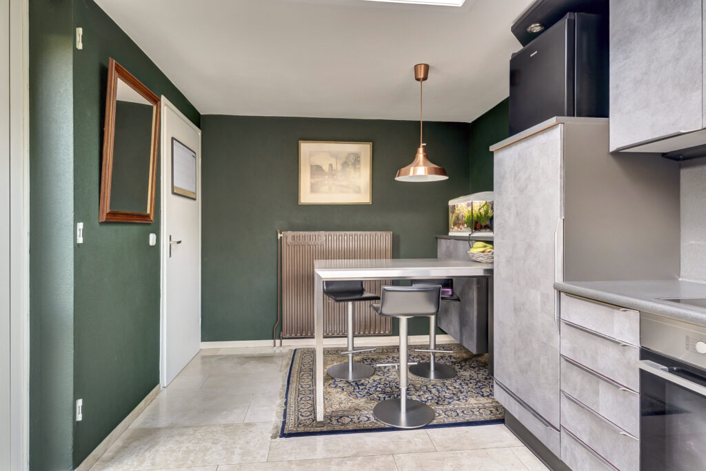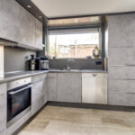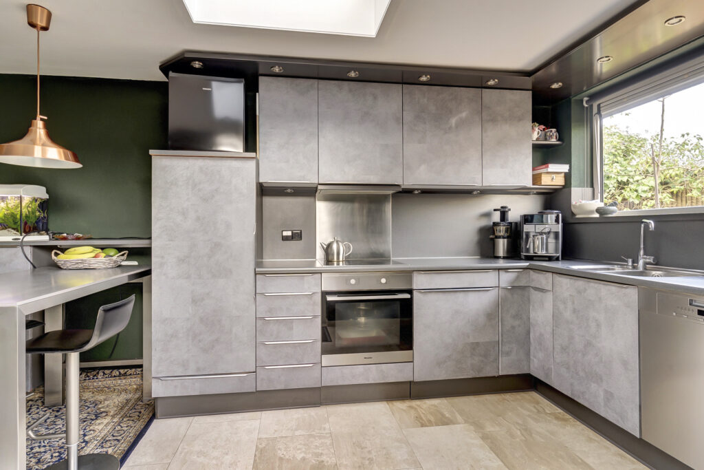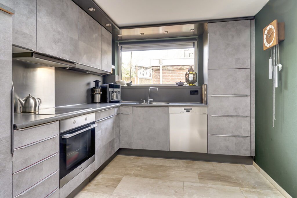 Vanuit de woonkamer is er toegang tot de verrassend ruime keuken, met dezelfde vloer en een lichtkoepel in het platte dak. De hoge tafel vormt een geheel met de lichtgrijze hoekopstelling, die volop bergruimte biedt. Het spoelgedeelte is aan de raamkant en de keramische kookplaat, afzuigkap, oven, vaatwasser en koelkast zijn ingebouwd.