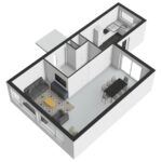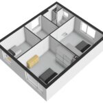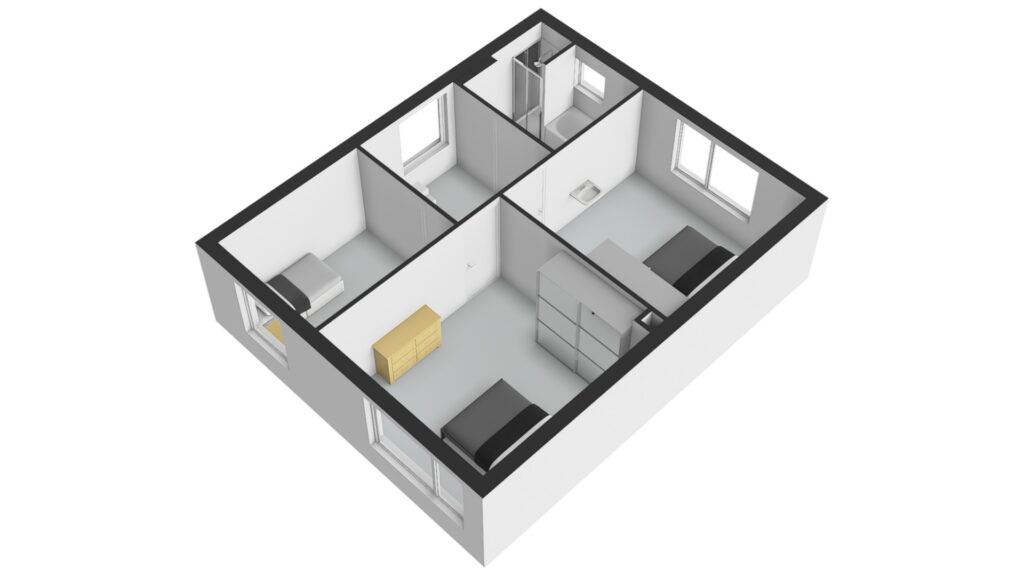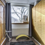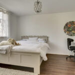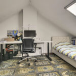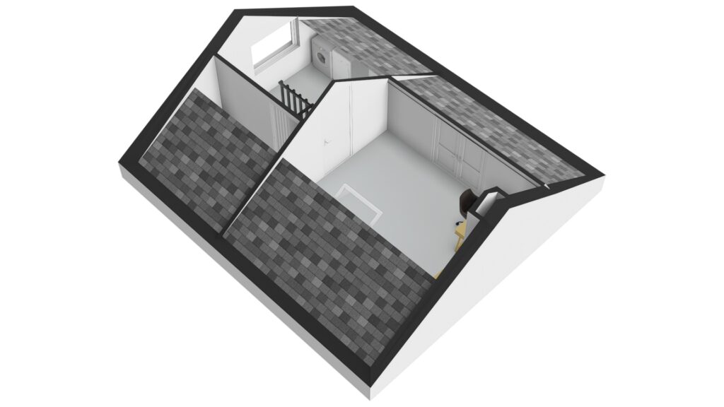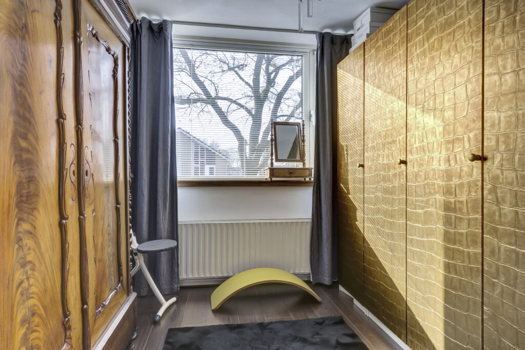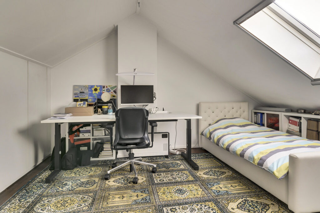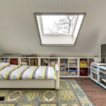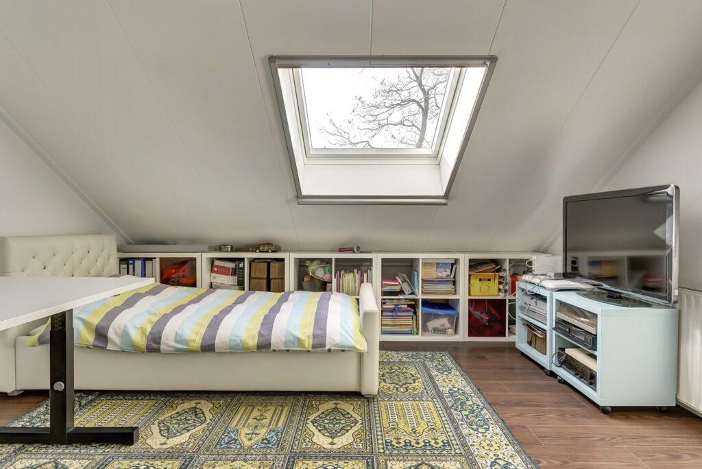 De slaapkamer op deze verdieping is een ruime kamer met een dakraam en een berging in de schuinte van het dak. Welke invulling geef je aan deze fraaie kamer?