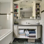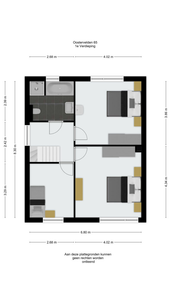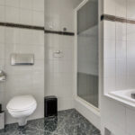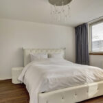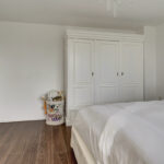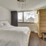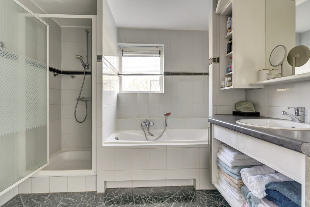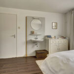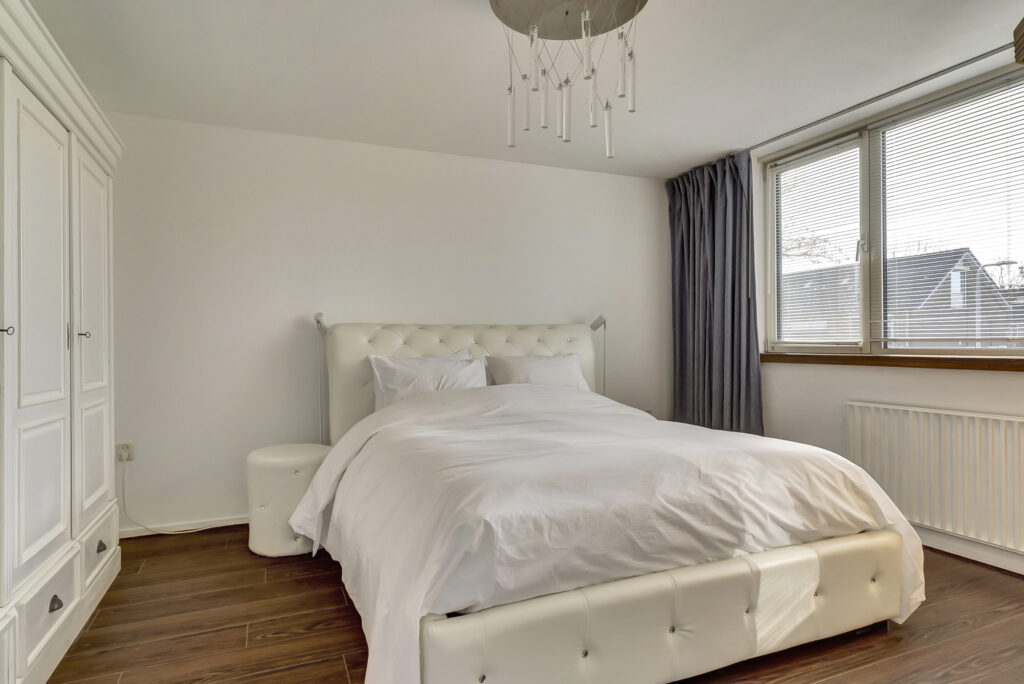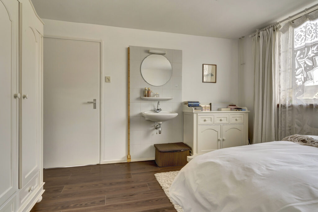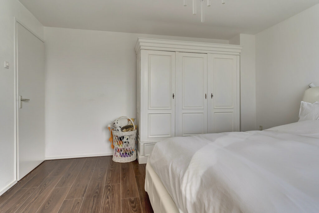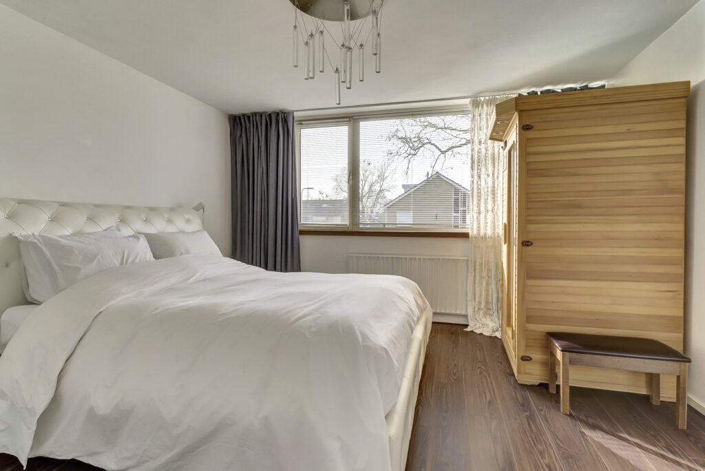 Er zijn twee slaapkamers aan de voorzijde, ingericht als tweepersoonskamer en kleedruimte, en in de ruime tweepersoonskamer aan de achterzijde hangt een wastafel. De badkamer, merendeels in lichte kleuren, is ingedeeld met een bad, aparte douche, een toilet en een wastafelmeubel. Ook deze ruimte heeft een groot raam, voor lichtinval en een goede ventilatiemogelijkheid.
