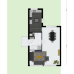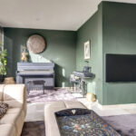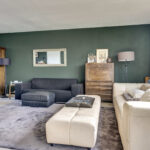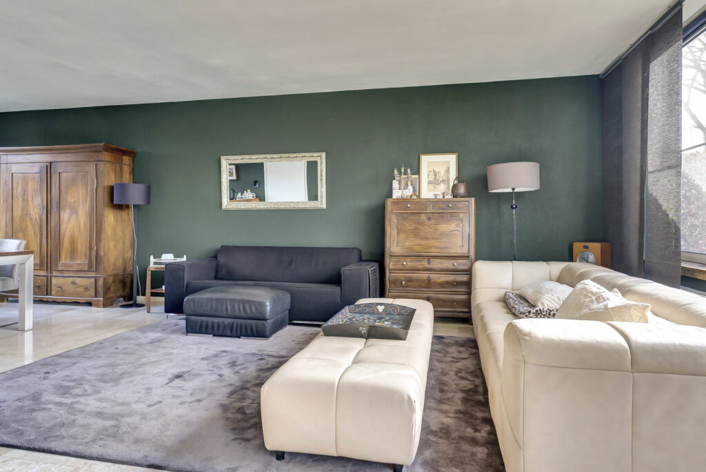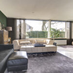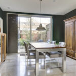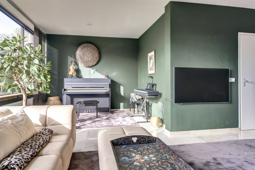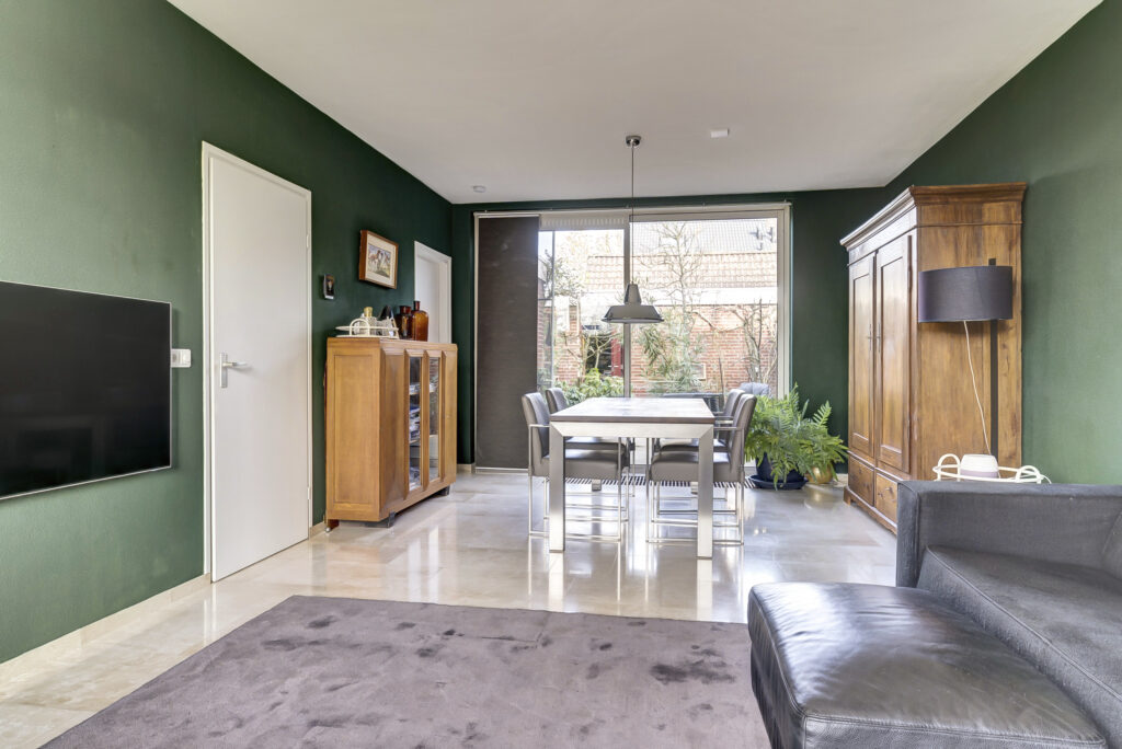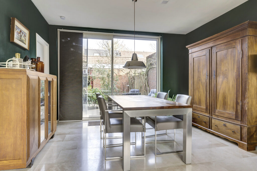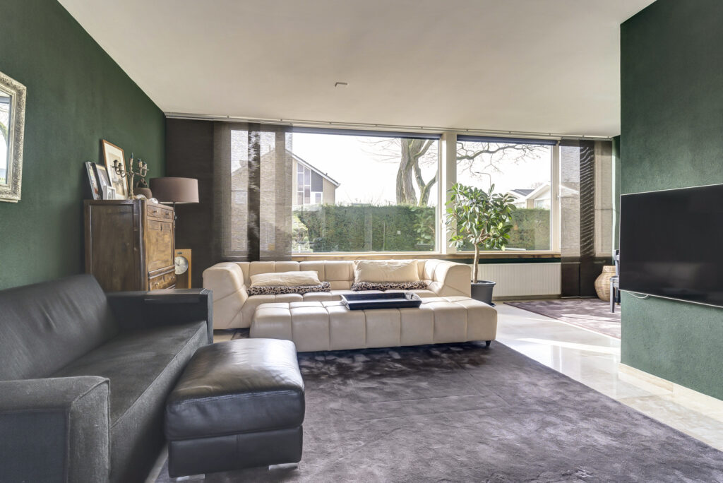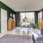 De L-vormige woonkamer heeft grote ramen aan de zuidkant en aan de andere zijde zorgt de schuifpui voor een mooie verbinding met de achtertuin. Er is gekozen voor een mooie, donkere kleur op de wanden en de lichte tegelvloer/travertin geeft de woonkamer een chique uitstraling.