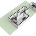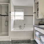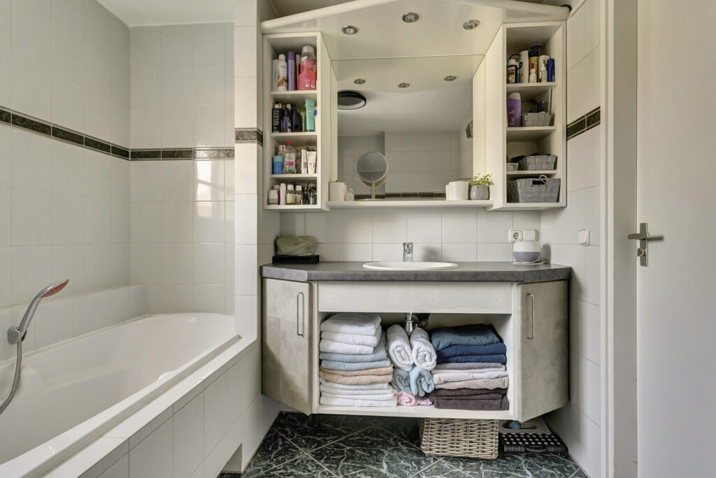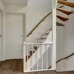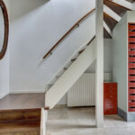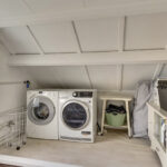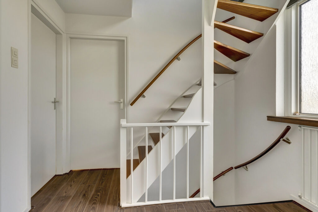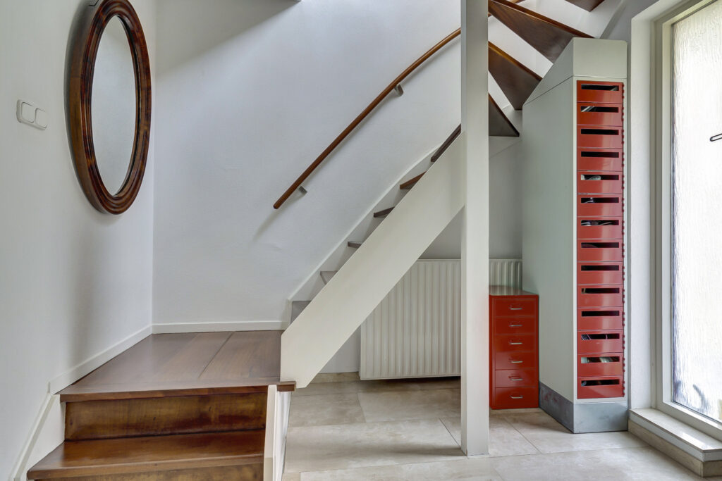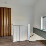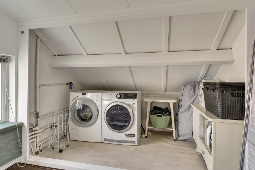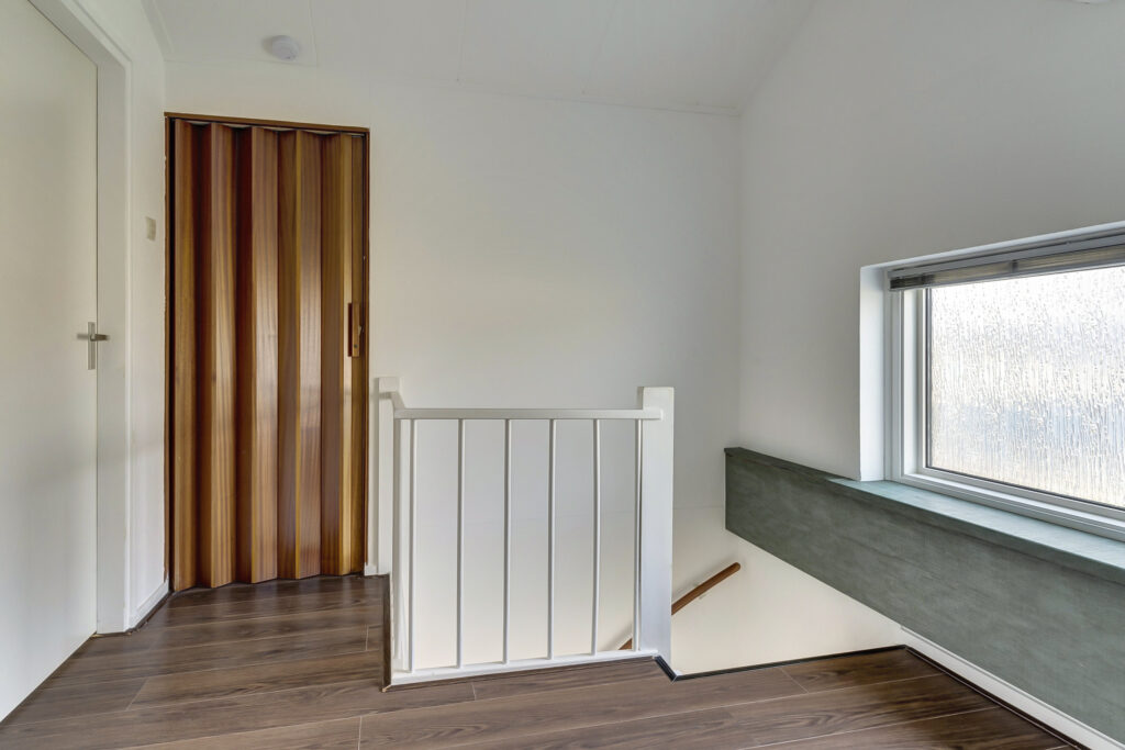 Ook de tweede verdieping heeft een raam in de zijgevel, wat de overloop heel ruimtelijk en licht maakt. Achter de harmonicadeur is een berging, met de opstelling van de HR-ketel. Aan de andere kant van de overloop is de opstelling van wasmachine en droger.