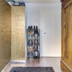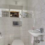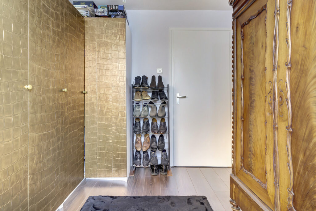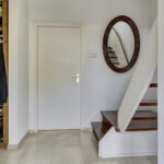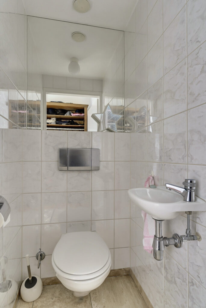 Om deze woning van binnen te bekijken, loop je via de oprit en de tuin naar de overdekte entree. Deze bevindt zich aan de zijkant van het huis, achter een hoge haag. Eenmaal binnen sta je in een ruime hal, met de meterkast en de trap naar de eerste verdieping. Vanuit de hal is er onder andere toegang tot de toiletruimte, met een wandcloset en een fonteintje.
