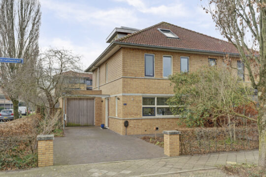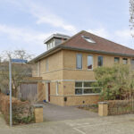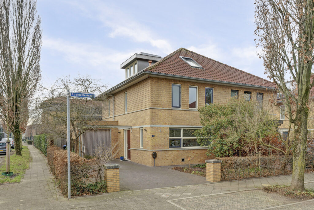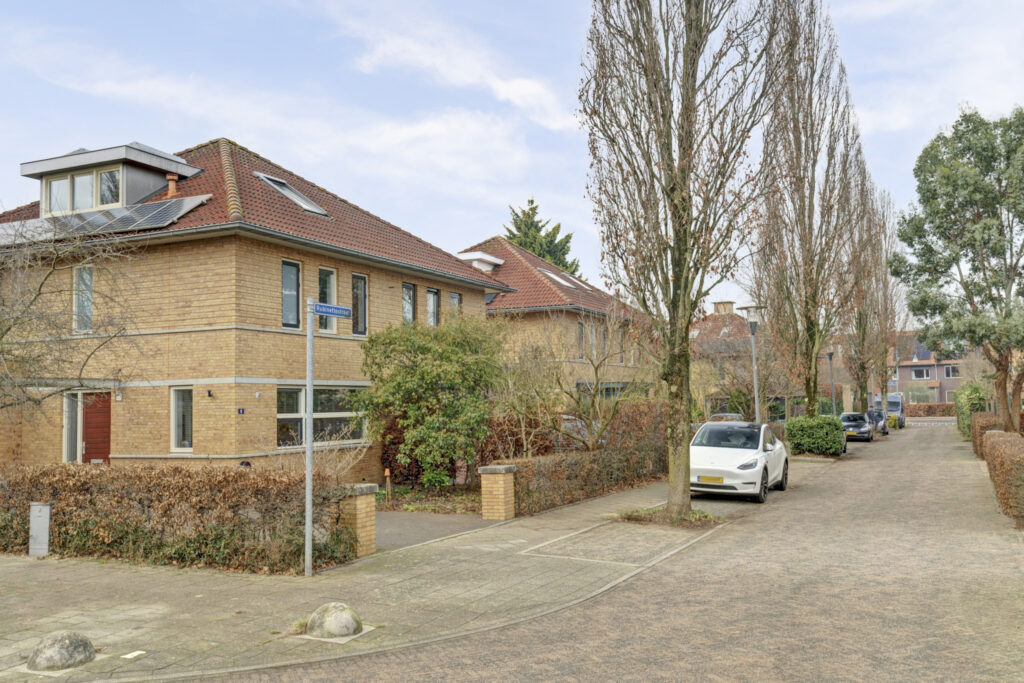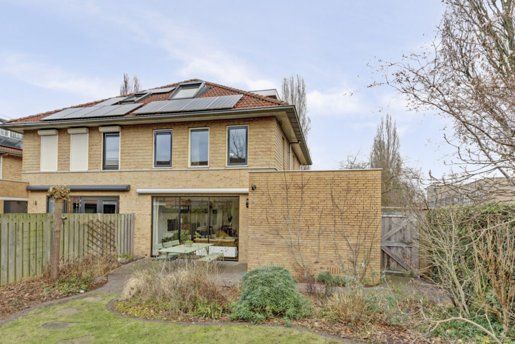 Wat een fraaie uitstraling heeft deze 2-onder-1 kapwoning, waarvan de architectuur is geïnspireerd op de jaren 30. Aan de voor- en linkerzijde van de oprit is een laadpaal geplaatst, perfect voor mensen met twee elektrische auto’s.