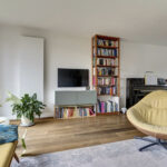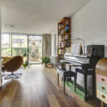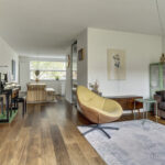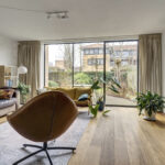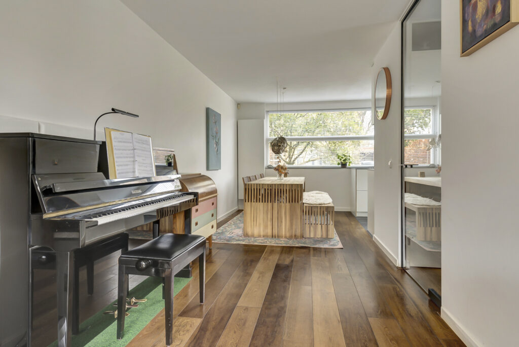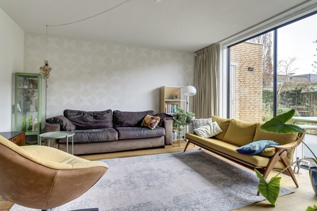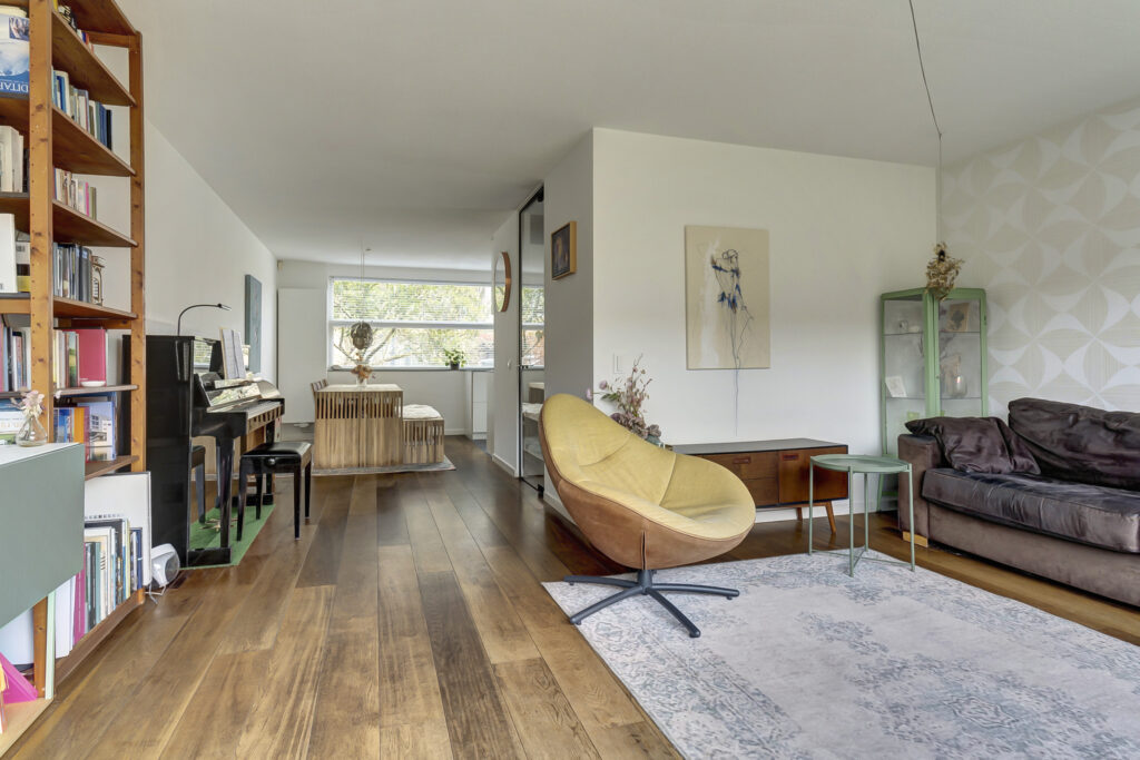 Vanaf het eetgedeelte loop je, via de muziekplek, naar het zitgedeelte. Hier is een grote stalen pui geplaatst, met ramen van vloer tot plafond en een deur naar de tuin. Er valt veel licht naar binnen en het uitzicht op de tuin is om in te lijsten. Het zitgedeelte is goed in te delen met een grote (hoek)bank, een fauteuil, tv-meubel en je favoriete woonaccessoires.
