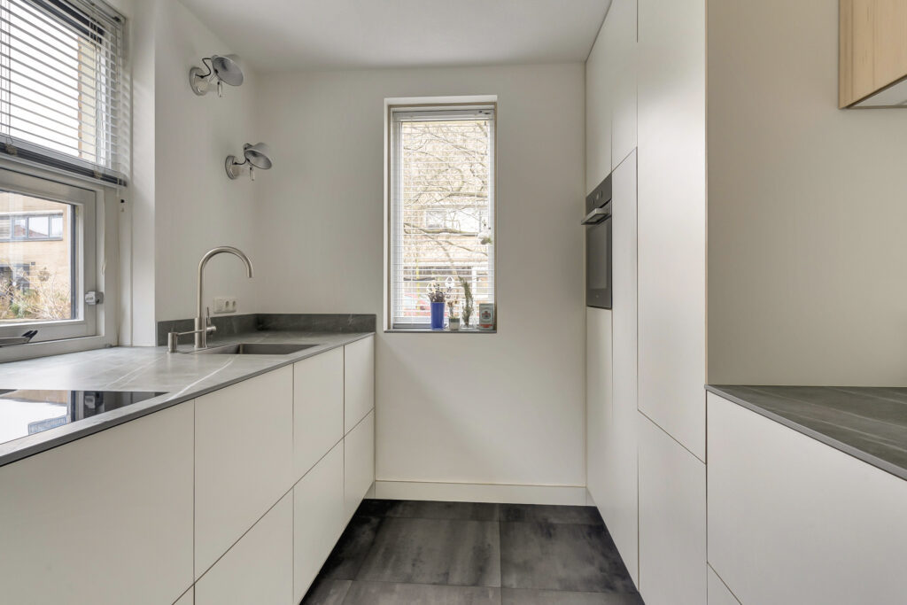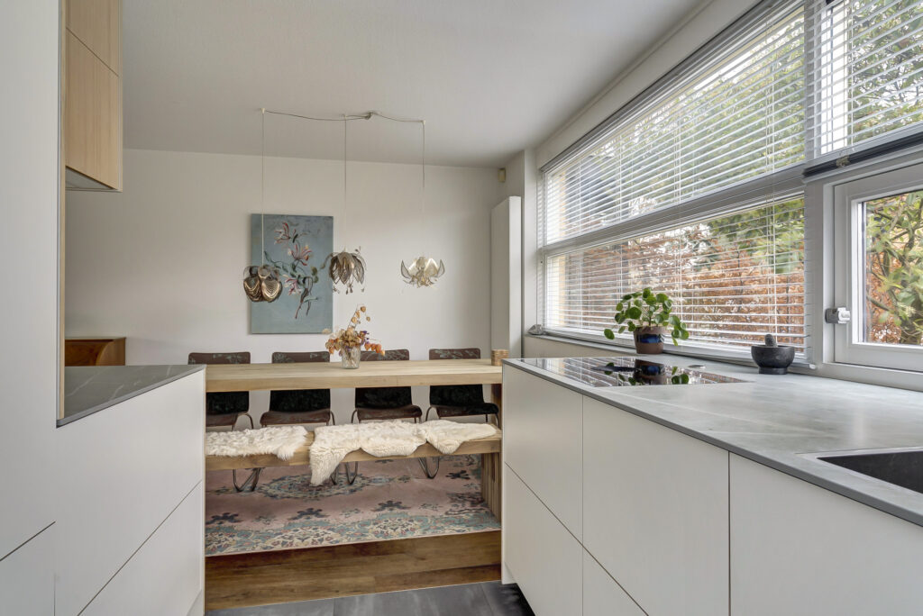 In de keuken wordt de sfeer bepaald door de lichte, dubbele wandopstelling (2019) met een stijlvol aanrechtblad en stoere vloertegels. Aan bergruimte is geen gebrek en de Bora Pure inductie kookplaat met afzuiging, de vaatwasser, oven, koelkast en vriezer zijn ingebouwd. Voor kook- en bakliefhebbers is dit een keuken die alles biedt!