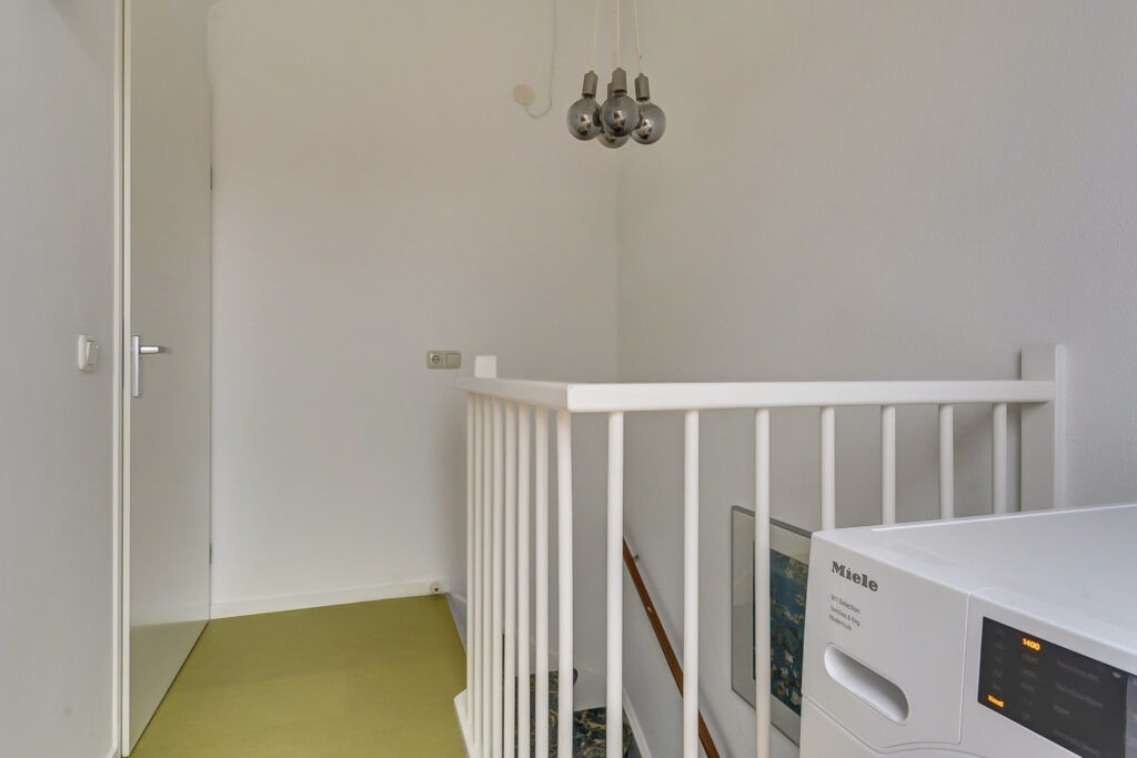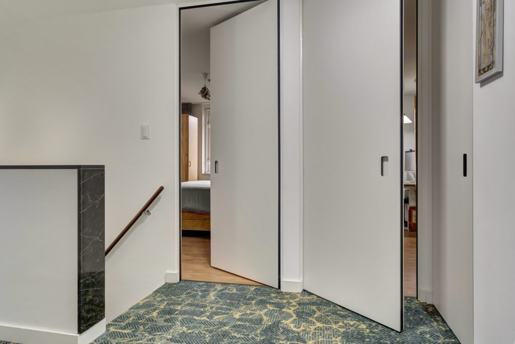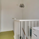Aan het einde van de trap is een mooie deur, die toegang geeft tot de overloop. Ook hier ligt tapijt, net als op de trap naar de tweede verdieping. Wat opvalt is dat de oorspronkelijke deuren zijn vervangen door designdeuren van hoge kwaliteit.