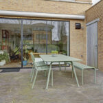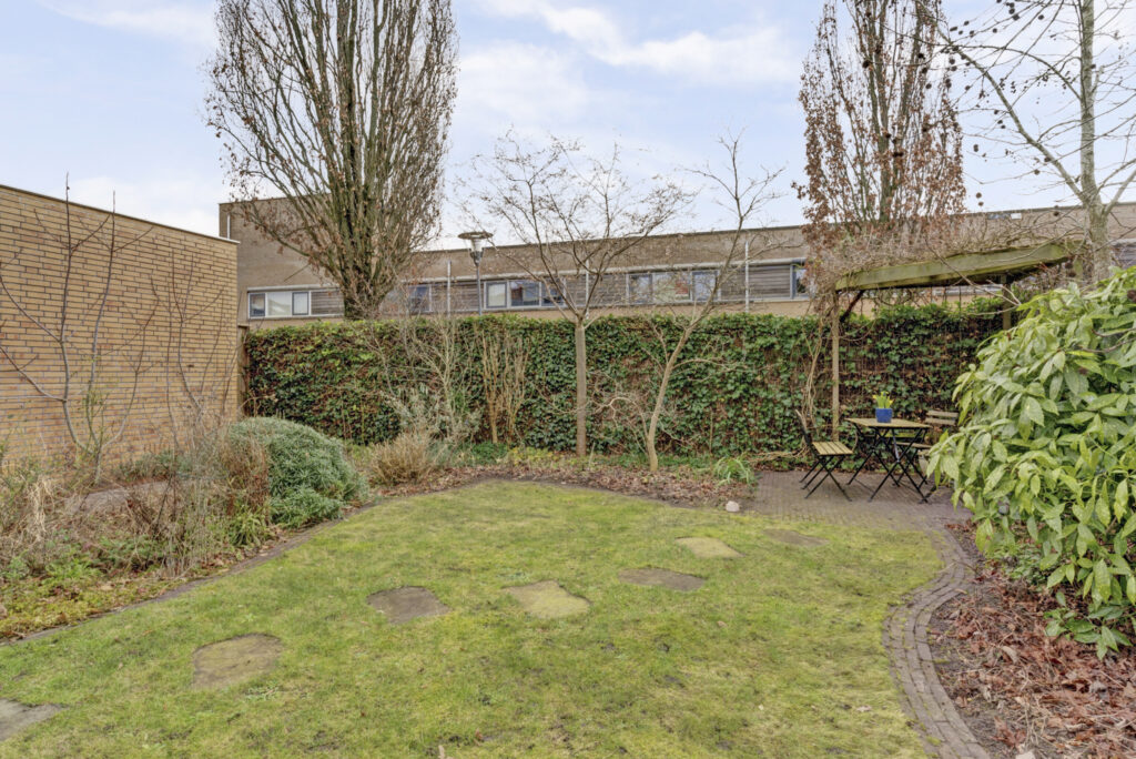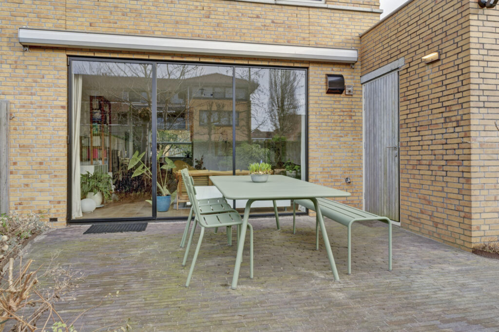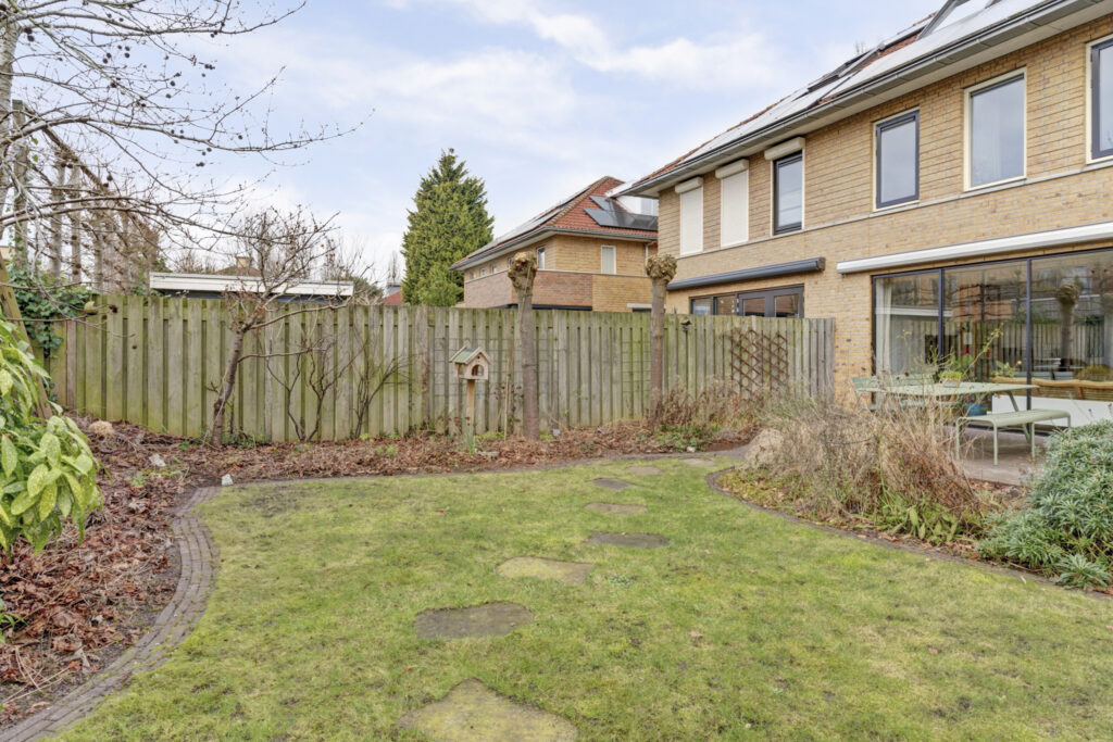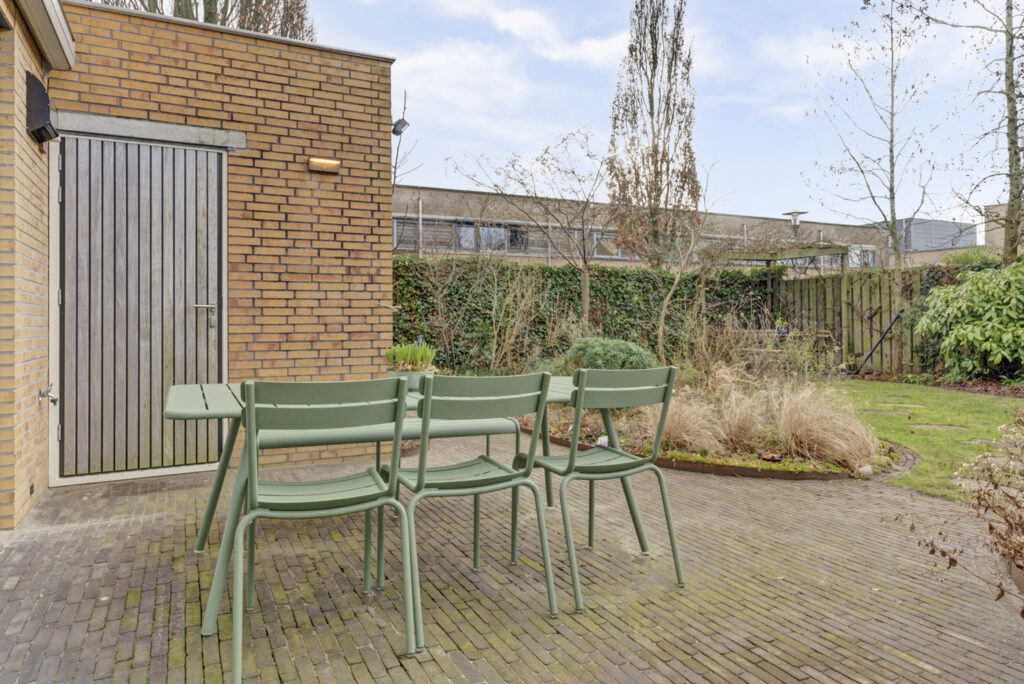 Dit bijzondere huis wordt aan drie kanten omringd door een tuin, waarbij de achtertuin op het zuidwesten gesitueerd is. Er is veel groen in de tuin, deels groenblijvend, en in de achtertuin zijn twee terrassen gemaakt. Kies je voor het grote terras met zonnescherm of het sfeervolle terras met pergola?